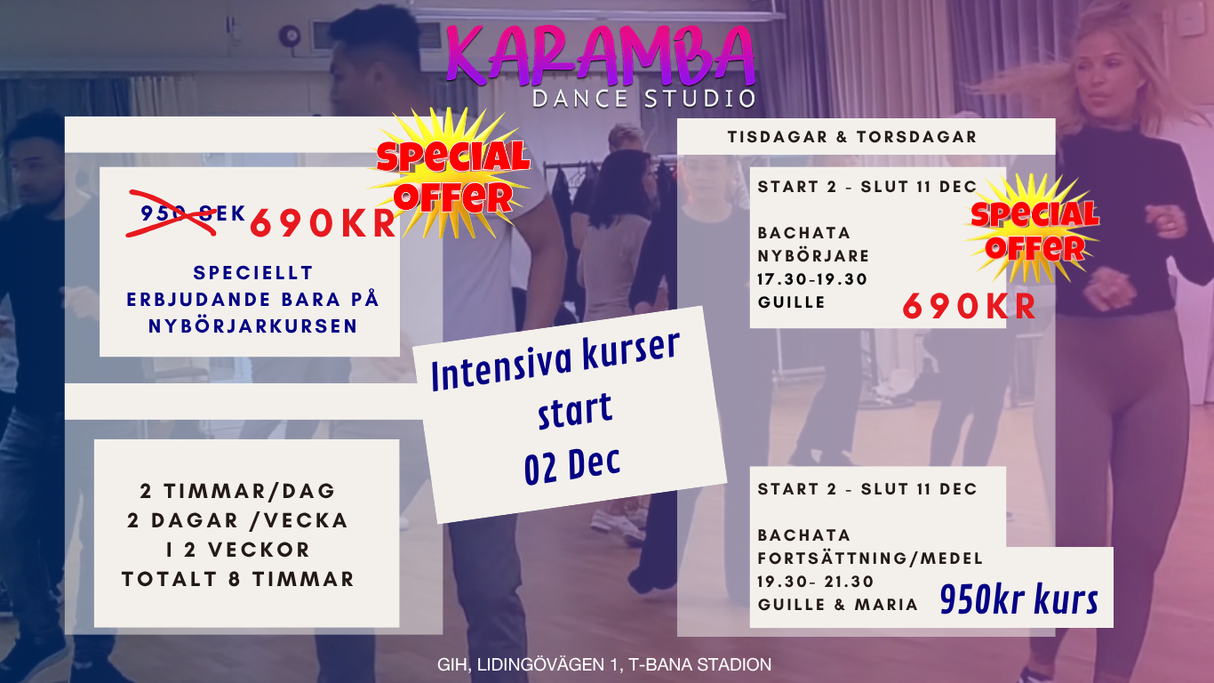 Vi erbjuder terminskurser i Bachata och Salsa för både nybörjare och de som vill bygga vidare på tidigare kunskaper. Vi arrangerar även sociala danskvällar och event där du kan öva på det du har lärt dig, oavsett om du är ny på dansgolvet eller har dansat länge.